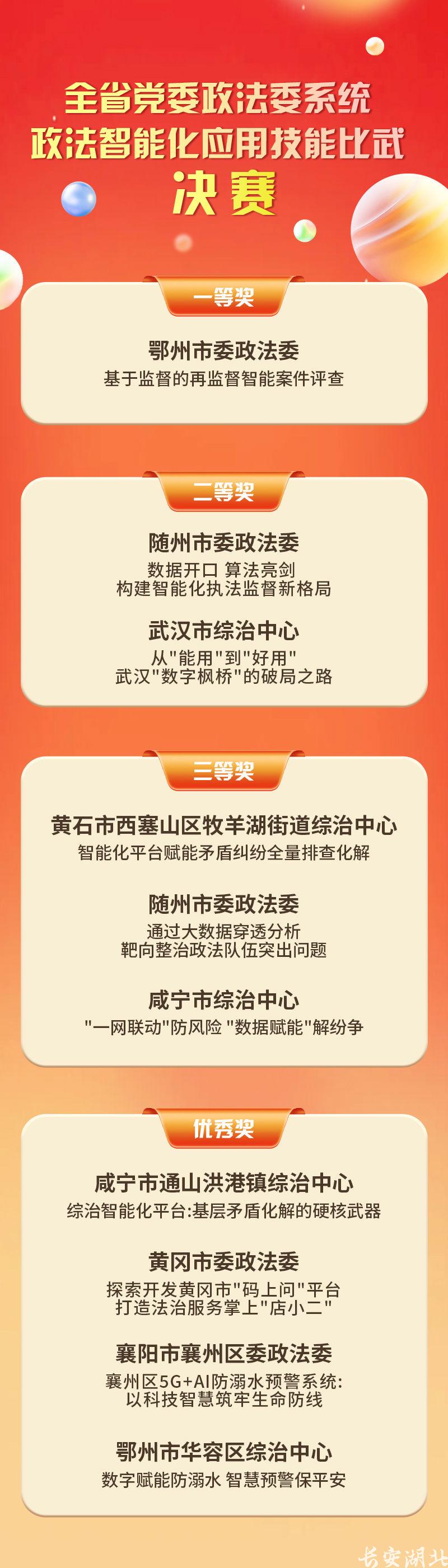 1月16日,全省党委政法委系统政法智能化应用比武决赛活动举行。经过激烈角逐,10个项目分获一、二、三等奖和优秀奖(详见海报)。